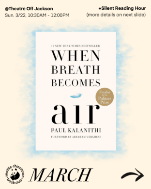 Seattle Chinatown Book Club presents their monthly book club meeting for the book, “When Breath Becomes Air” by Paul Kalanithi. Additionally, there is a silent reading hour occurring at the same time as the book club meeting.