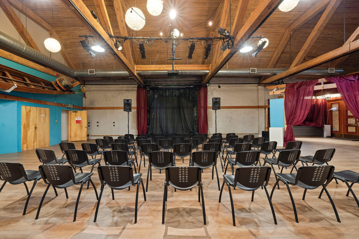 A historic theatre, featuring a full stage, lighting infrastructure, and backstage support spaces.